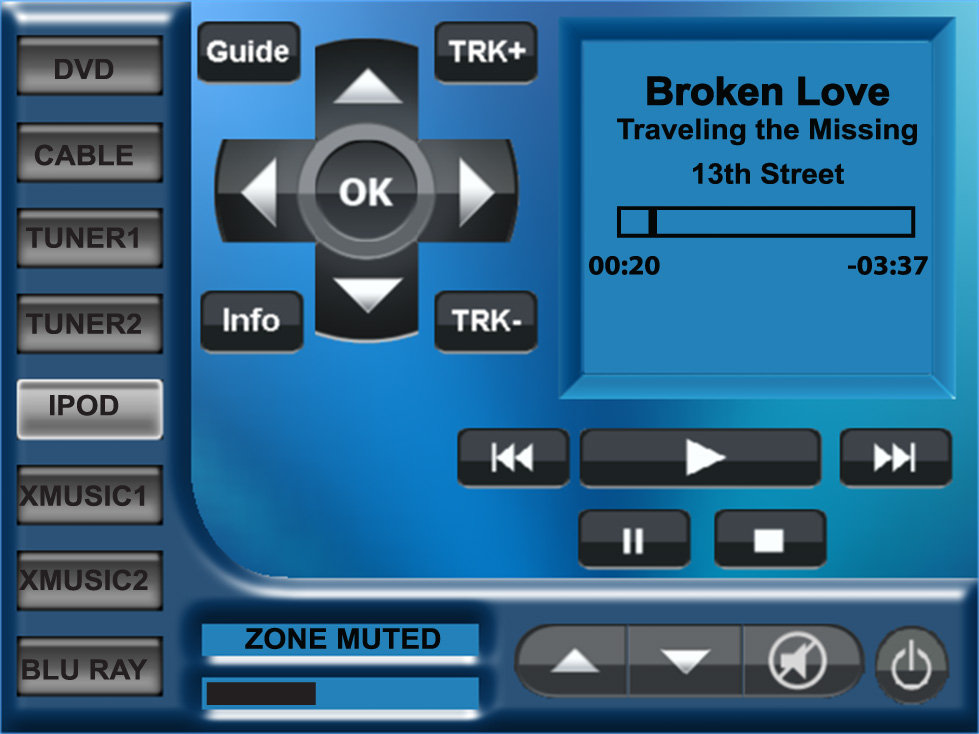 source buttons (e.g. iPod, DVD, Satellite, etc.). The pages under each