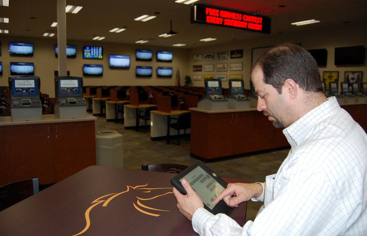 Dan Farrell, Director of Media and Marketing for Capital District Regional Off Track Betting, controlling the system at the new OTB Clubhouse Race book with a Xantech CWTC10 10.4” Wireless Touch Controller.