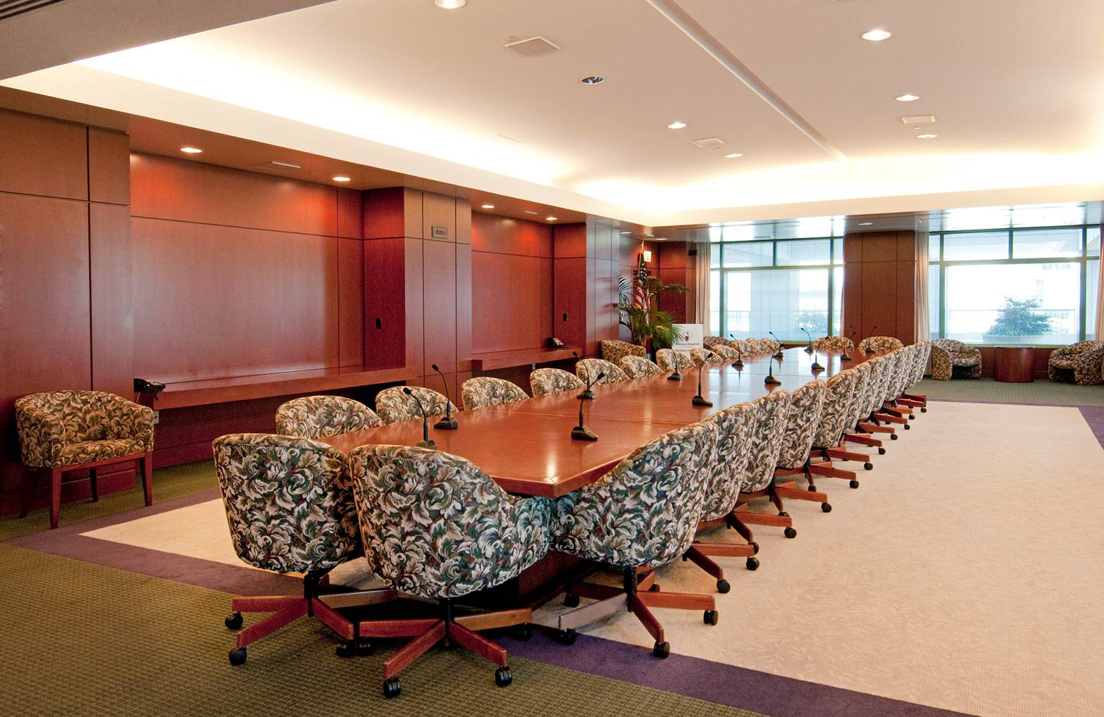 The boardroom, measuring approximately 40 feet wide by 100 feet long, with glass along two sides, hosts monthly hospital board meetings. During the interim it is used for meetings by staff, doctors, visiting VIPs and outside groups, according to Clark, a Shriner and former board member.