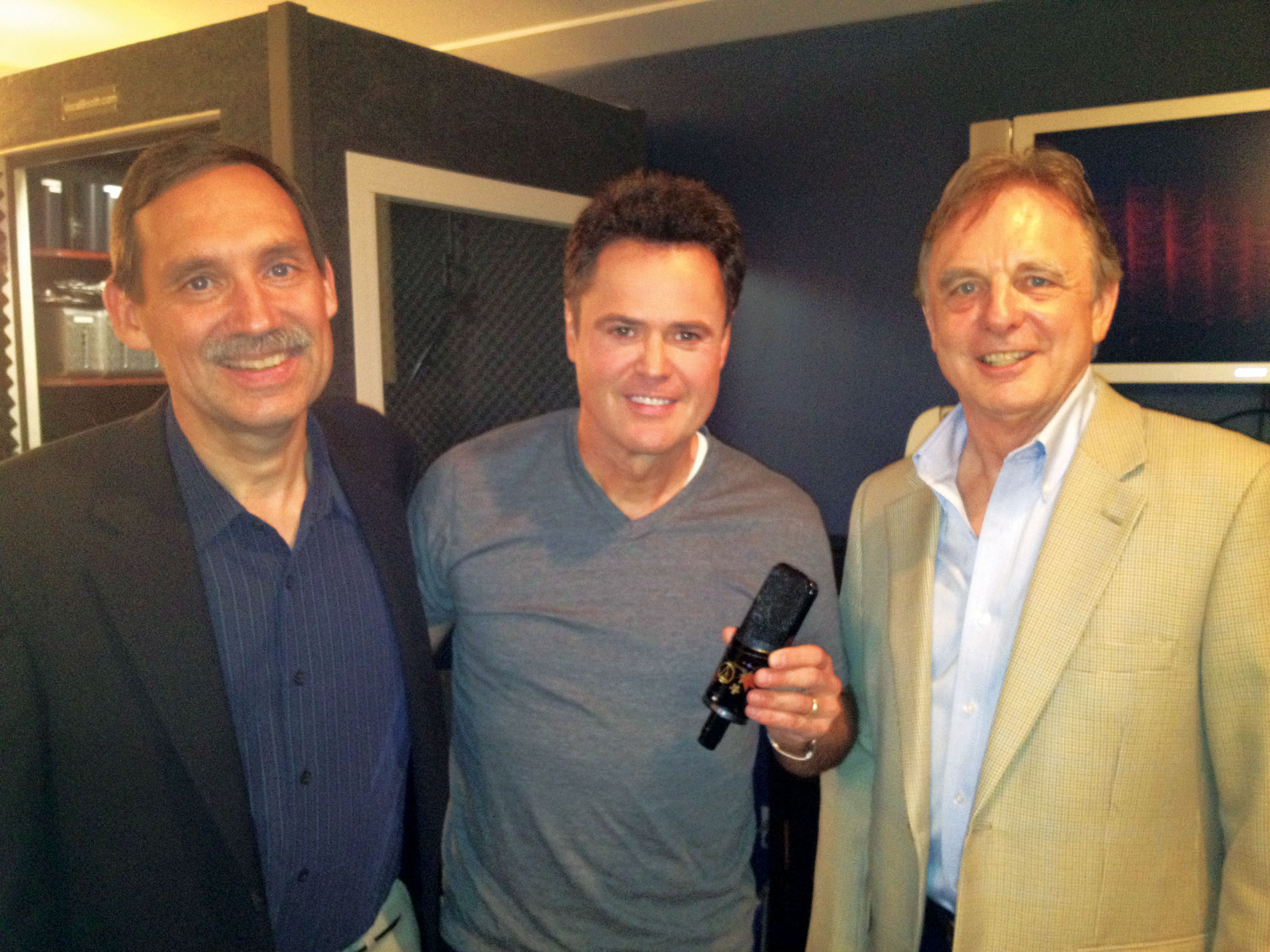 STOW, OH, August 6, 2012 — As Donny and Marie Osmond continue their hugely successful run at Las Vegas’ Flamingo Hotel, Audio-Technica is proud to be the microphone of choice for the superstar siblings’ act. Between recent performances, Donny Osmond (center) was presented with a limited edition AT4050URUSHI Multi-pattern Condenser Microphone. The AT4050URUSHI, a visually striking version of Audio-Technica’s acclaimed AT4050, was created to commemorate A-T’s 50th anniversary and sports a stunning traditional urushi lacquer finish with hand-painted Japanese maple leaves. The microphone was presented to Osmond by Philip Cajka (left), Audio-Technica U.S. President & CEO; and Michael Edwards (right), Audio-Technica U.S. V.P. Professional Markets. Photo by Roxanne Ricks, Audio-Technica Artist Relations Manager. |