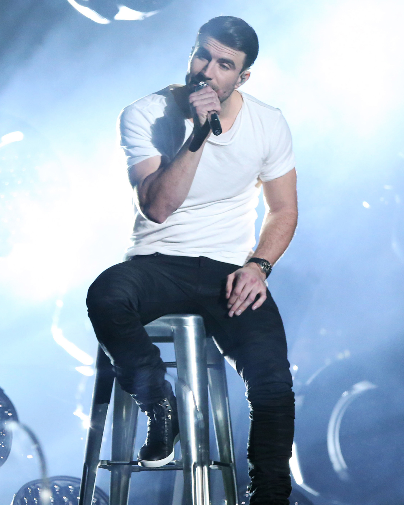 STOW, OH, February 17, 2016 — Audio-Technica, a leading innovator in transducer technology for over 50 years, once again provided a number of microphones for the GRAMMY® Awards telecast, which this year took place live at the Staples Center in Los Angeles on Monday, February 15, 2016, and was broadcast live in all four continental U.S. time zones on the CBS network. Pictured is country artist Sam Hunt, who performed in a duet sequence with Carrie Underwood, utilizing an Audio-Technica 5000 Series wireless microphone system with AEW-T5400a microphone/transmitter for his lead vocal. Photo by Matt Sayles/Invision/AP. (This photo is the property of Matt Sayles/Invision/AP and may be used by the press only for the purpose of one-time reproduction. Unauthorized use, alteration or reproduction of this photograph is strictly prohibited.)