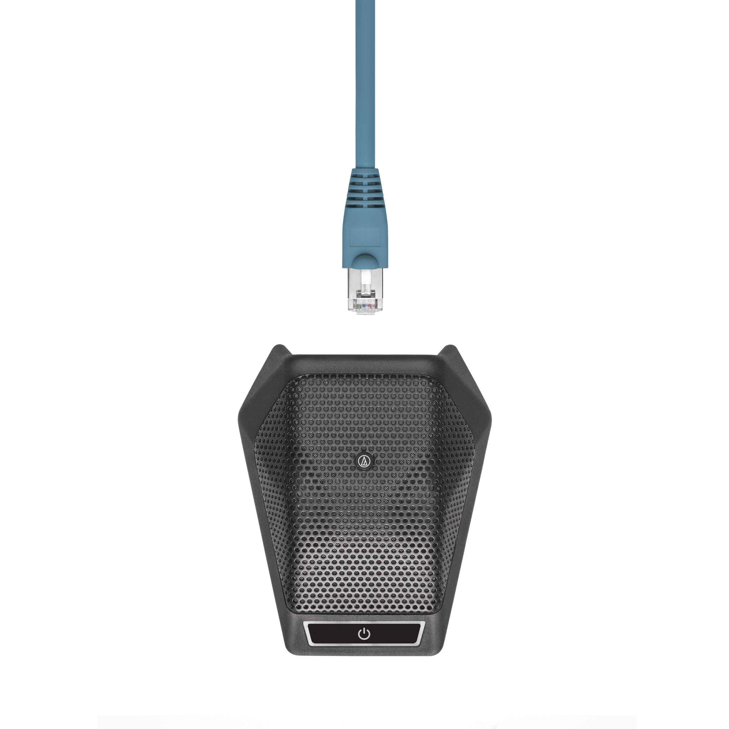A true audio/IT convergence, the ATND971 boundary mic not only delivers the superior audio you would expect from Audio-Technica, with outstanding speech intelligibility and transparent sound quality, but it also transmits control data to communicate across a network of Dante-enabled devices. The integrated programmable user switch allows users to trigger a video camera’s pan/tilt, recall lighting presets or control anything else on the network at the push of a button. And with a Red/Green LED the microphone can visually convey mute status, incoming phone calls or other creative visual effects utilizing a control system. The microphone plugs into the network via Ethernet cable – easy to install and operate. Features UniGuard® RFI-shielding technology and UniSteep® low-cut filter.