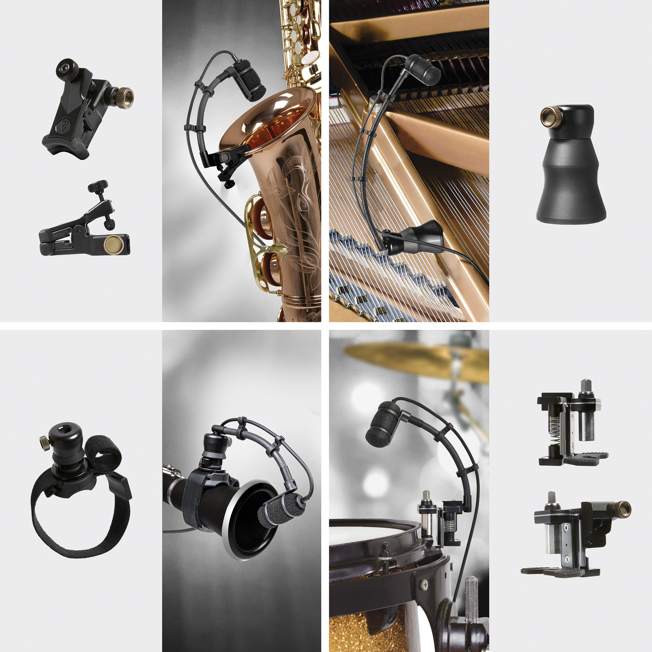 Os seis sistemas de microfone ATM350a combinam o microfone para instrumentos com os componentes exclusivos do UniMount®, oferecendo várias opções de montagem confiáveis aos engenheiros e músicos sempre que estiverem trabalhando no palco ou no estúdio. As opções incluem suporte resistente para bateria, novo suporte magnético para piano, suporte de lapela universal atualizado, suporte expansível para instrumentos de sopro e dois pescoços de ganso flexíveis e robustos (5 pol. e 9 pol.), que podem ser instalados em qualquer um desses suportes.