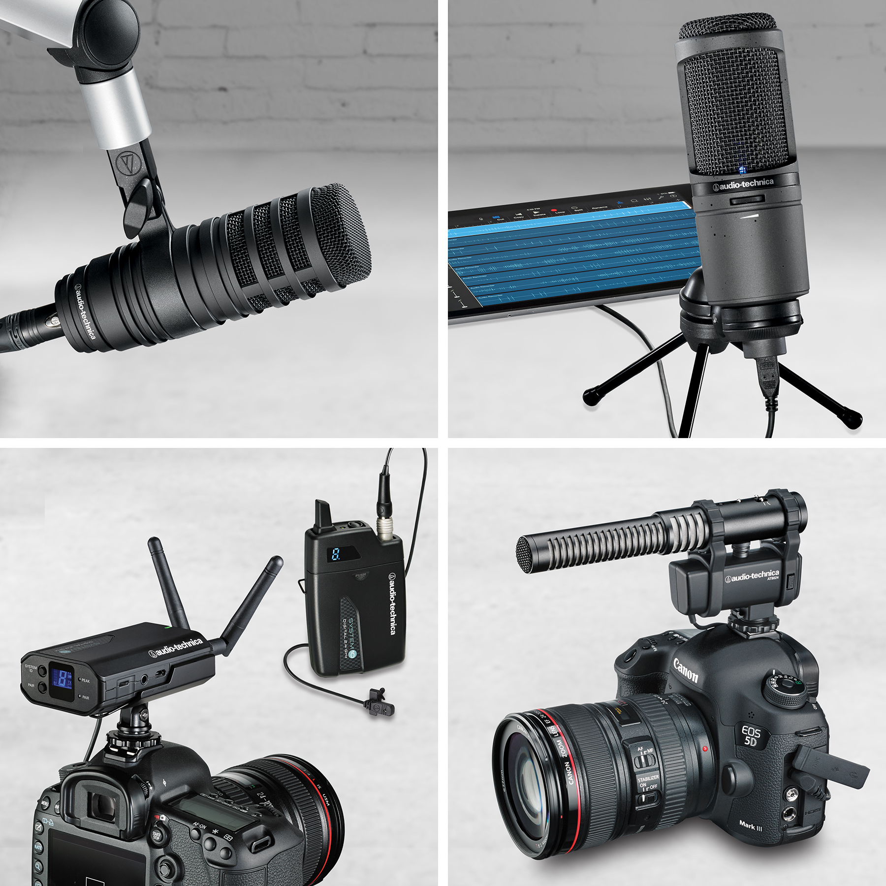 Los productos destacados de A-T son el micrófono para montaje en cámara estéreo/mono AT8024, los micrófonos USB de condensador cardioide AT2020USB+ y AT2020USBi, el sistema inalámbrico digital para montaje en cámara System 10 , el micrófono dinámico para retransmisiones de diafragma grande BP40 y el micrófono dinámico cardioide USB/XLR AT2005USB.