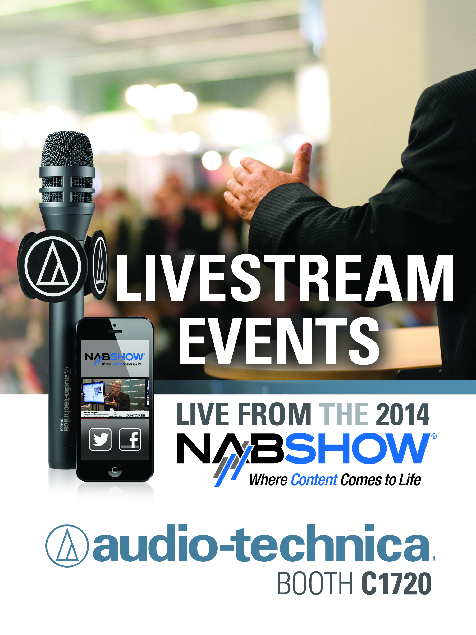 NAB SHOW, LAS VEGAS, NV, April 7, 2014 — Following successful booth events at other recent trade shows, Audio-Technica (Booth C1720), a leading innovator in transducer technology for over 50 years, is hosting 15 Livestream events at its booth at NAB 2014.
