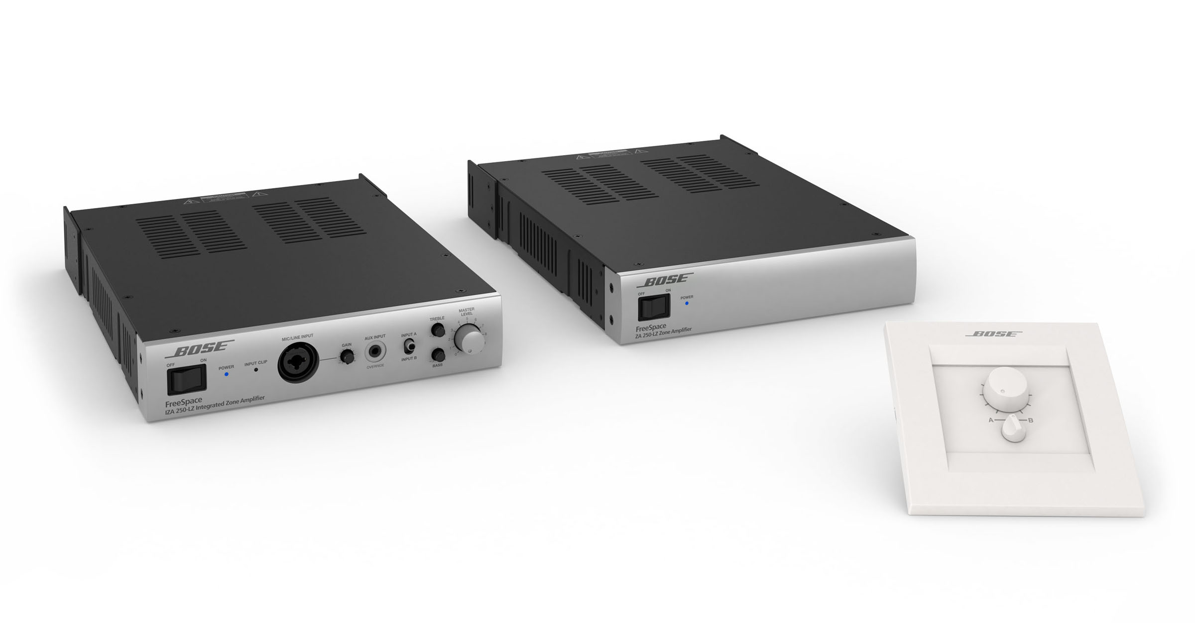 The new FreeSpace ZA zone amplifiers provide basic amplification and sound system expansion when using front-end signal processing from Bose FreeSpace business music systems and Bose ControlSpace® engineered sound processors. They can also be combined with the FreeSpace IZA amplifiers to function as one system -- with double the power -- sharing the same music paging sources, master volume control, and optional loudspeaker equalization.