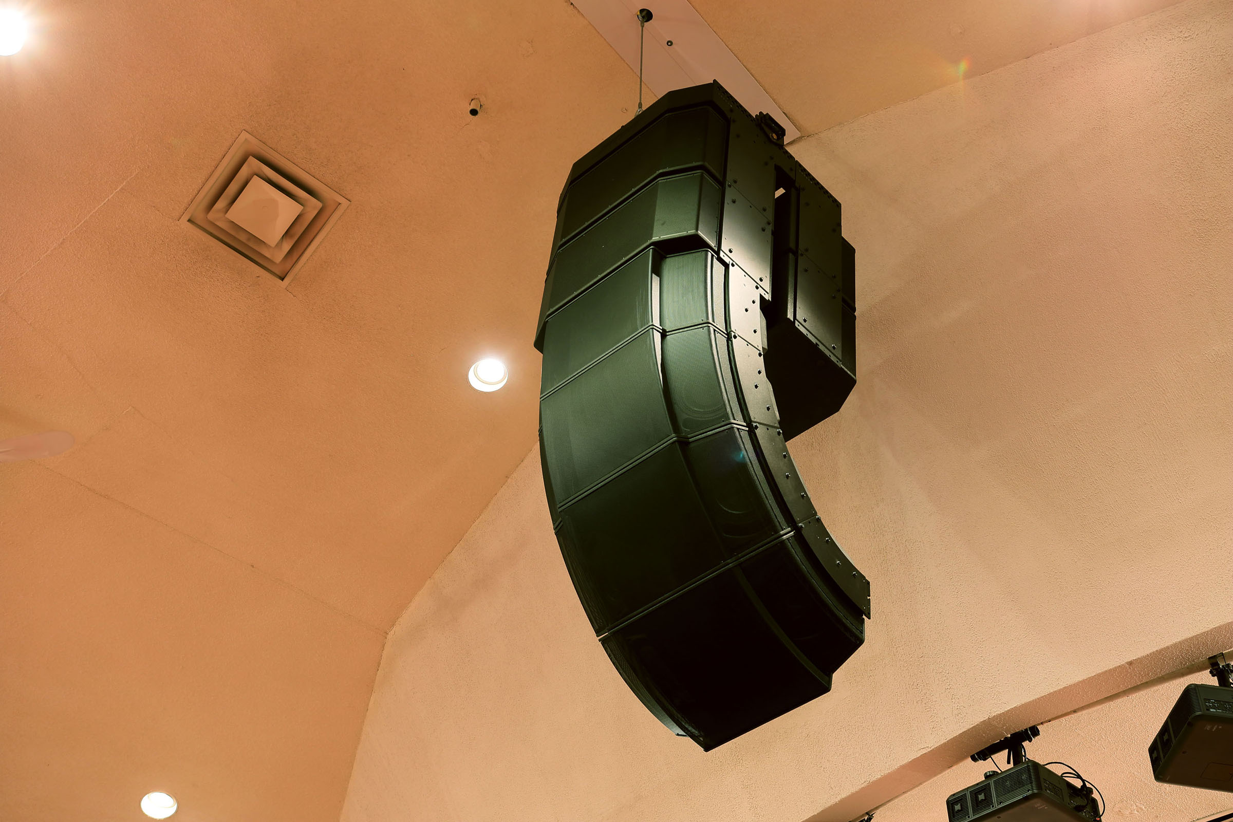 Westbury National installed a Bose system consisting of three hangs of four RoomMatch enclosures each, with four RoomMatch RMS215 subwoofers flown above the center array. Three more RMS218 subs are mounted underneath the stage; six more RoomMatch enclosures provide under-balcony coverage, and two more are used as choir fills. Nine networked PowerMatch® PM8500N amplifiers power the entire system.
