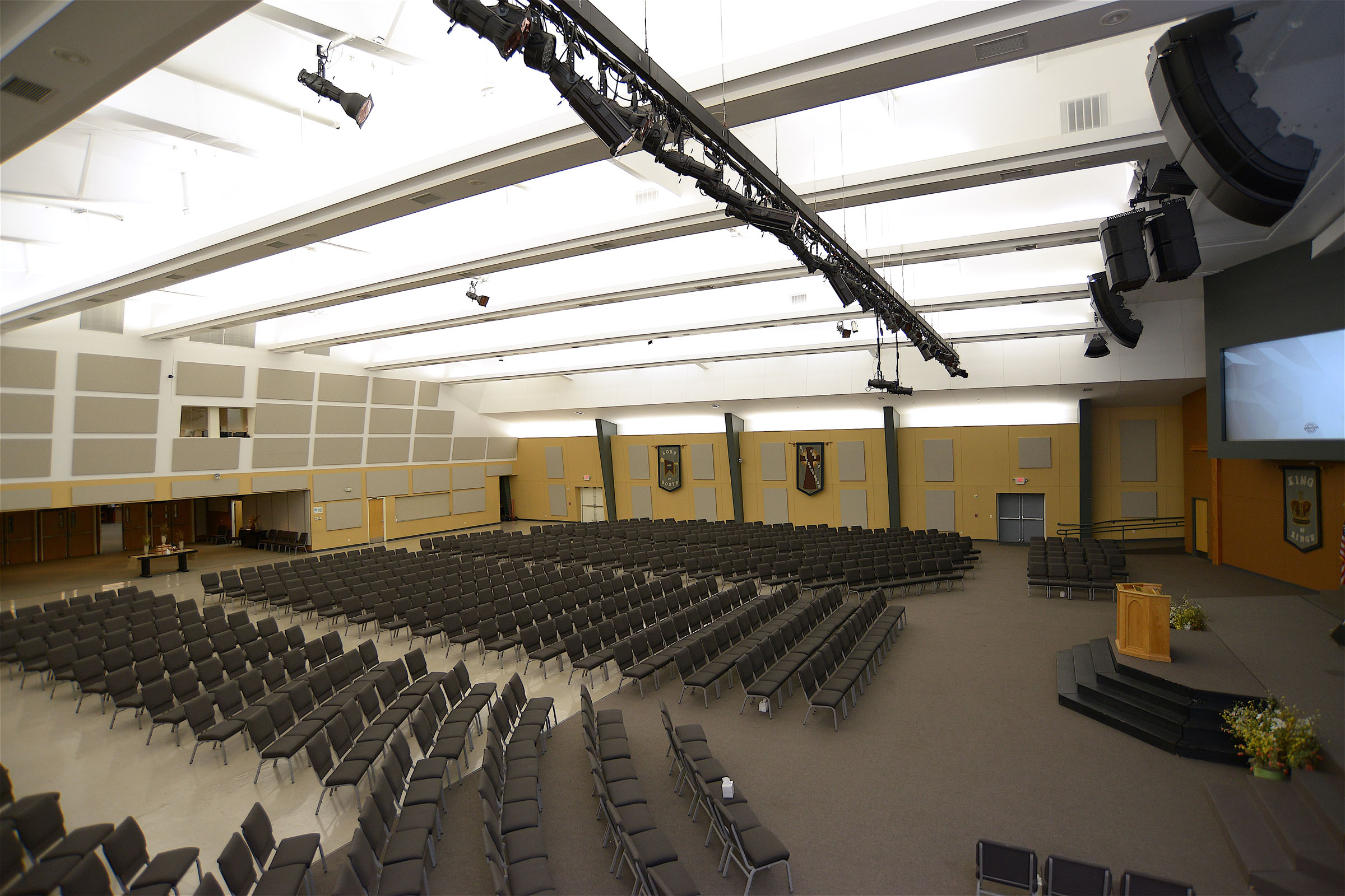 EMI Audio designed a system composed of four RoomMatch enclosures in each of two left-right hangs. These flank a central cluster of four Bose RMS215 dual-15-inch subwoofers. Two additional RoomMatch speakers serve as fill speakers at the far ends of the stage. In addition, three RMU208 utility speakers were installed as delay speakers for the entryway to the Sanctuary. Fifteen Bose DS100F FreeSpace® ceiling loudspeakers are employed for a separate distributed lobby sound system. These are all powered by six Bose® PM8500 PowerMatch® amplifiers.