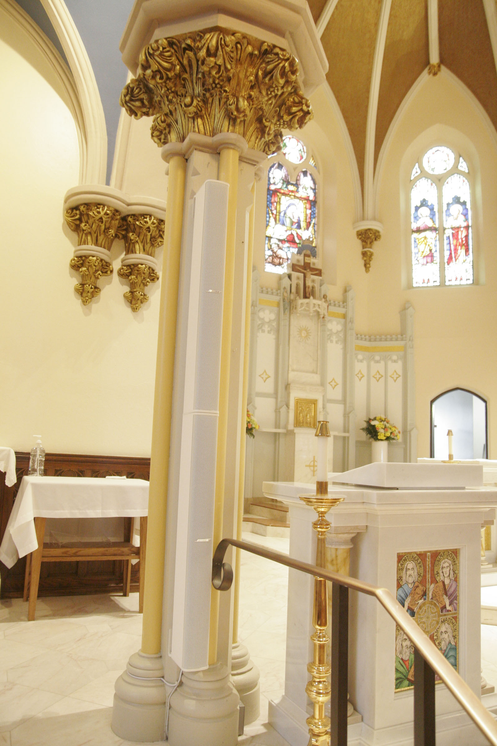 Photo caption 3: Closeup of Bose Professional Panaray MSA12X (on pillar) installed at Our Lady of Good Counsel Church in Moorestown, NJ, by AV systems integrator Whitaker Brothers North. |