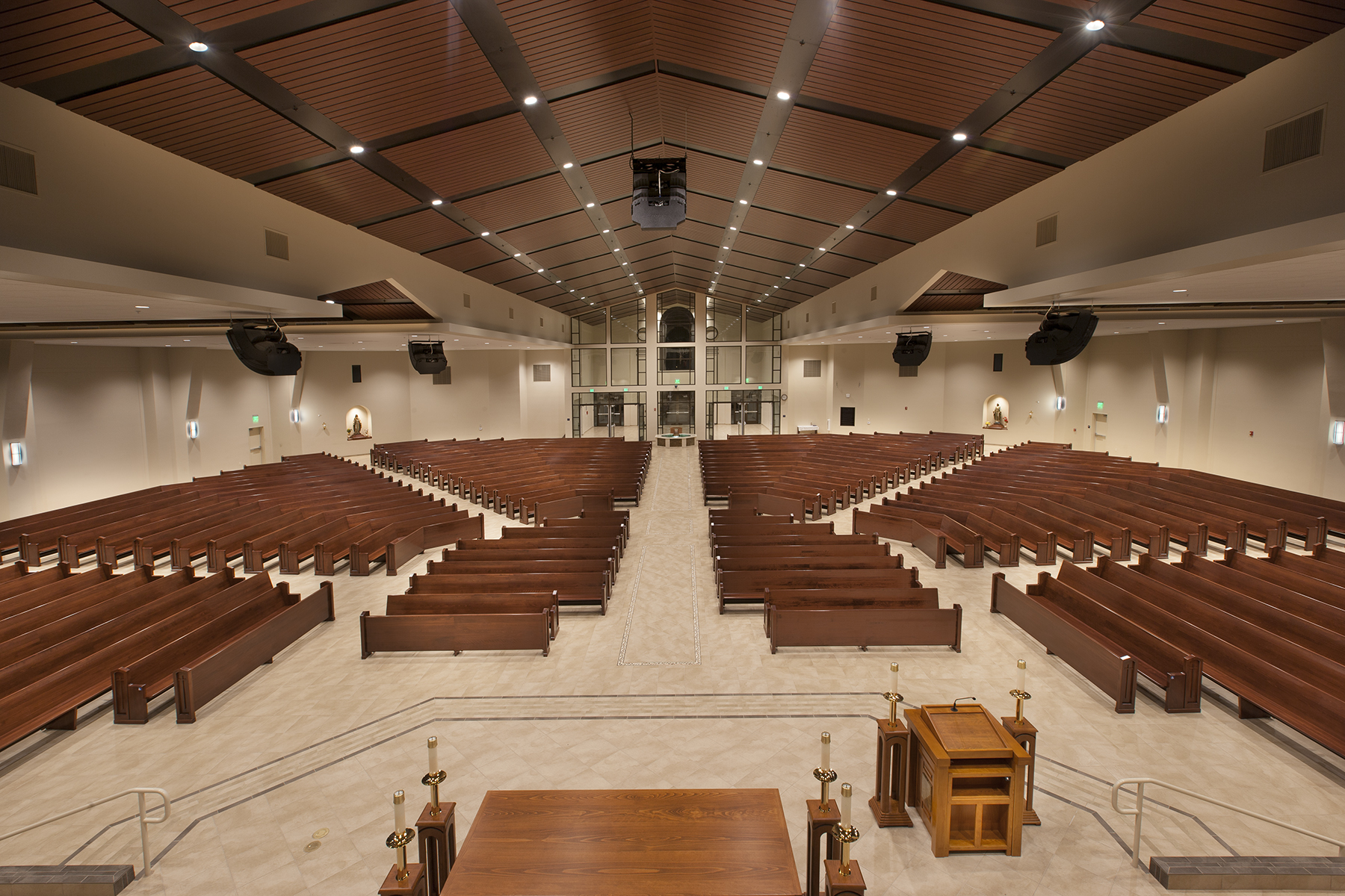 Framingham, MA, January 9, 2018 – Queen of Angels Catholic church in Riverside, CA, recently had their dream come true with the completion of a brand new 1,600-seat church facility. The project represented the fruits of fundraising work done by the congregation over the past decade that included bake sales, fiestas, galas, raffles, and even priests running marathons. The new sanctuary presented some acoustical challenges for AV systems integrator Sunset Audio Visual of Upland, CA – challenges met and bested by the capabilities of a Bose Professional RoomMatch® DeltaQ™ system.