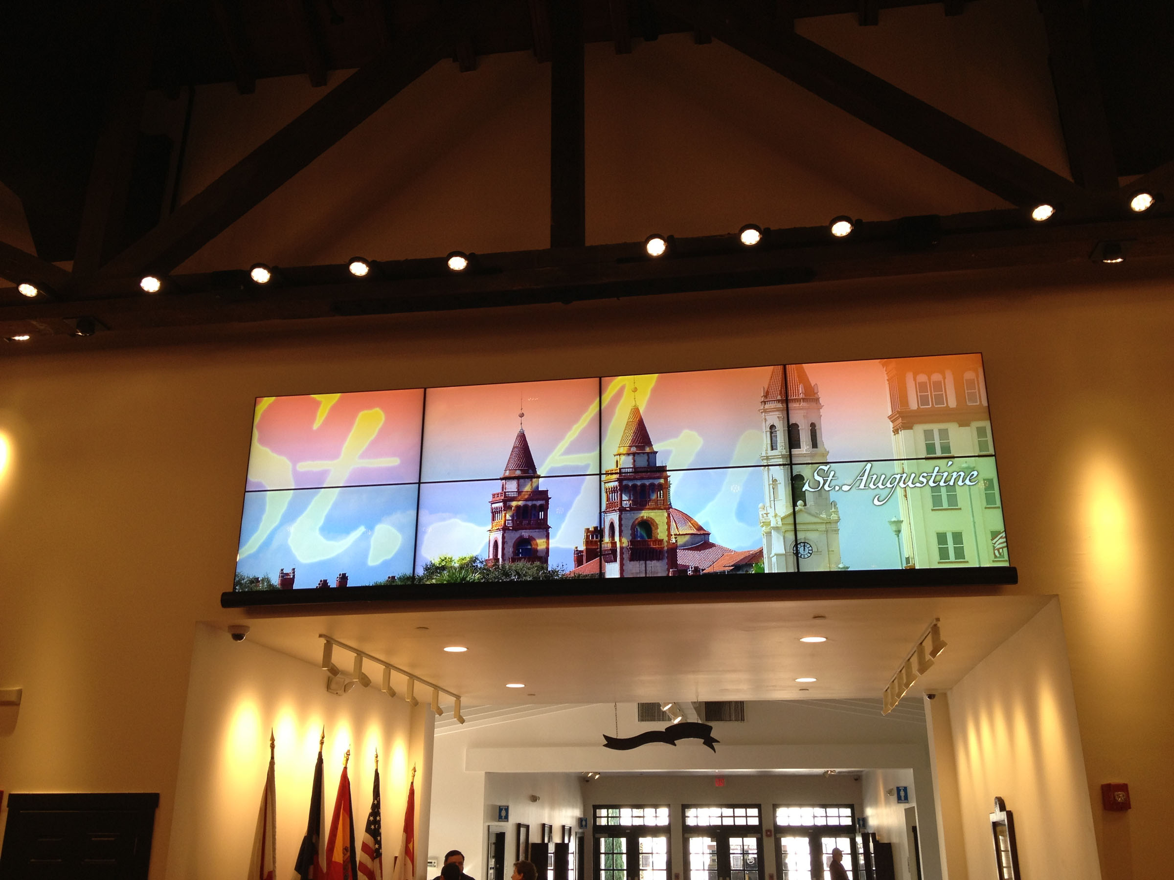 Framingham, Massachusetts, July 14, 2014 – For half a century, visitors to St. Augustine have made the St. Augustine/St. Johns County Visitor Information Center (VIC) their first stop upon arriving in what is officially the United States’ oldest continuously-inhabited city and European settlement. The center offers information on special and cultural events, brochures and guidebooks for the area's attractions and a gift shop. But while the VIC’s architecture evokes the region’s Spanish past, its large main hall also presents acoustical challenges. Fortunately, the thousands of visitors who are introduced to the region’s attractions via a high-definition videowall installation hear every bit of information clearly, thanks to a Panaray® modular line array sound system from Bose® Professional Systems. The Panaray system, consisting of three MA12EX loudspeakers, was installed by RP|AV Audio Video Design & Installation of Bowersville, Georgia, and acts like a high-definition soundbar for the videowall consisting of eight 55-inch LCD displays, also installed by RP|AV. The project was part of a larger renovation of the VIC that also included a celebrated exhibition of 39 Picasso pieces from Málaga, Spain, the artist’s birthplace, put on as part of St. Augustine’s 450th anniversary commemoration.