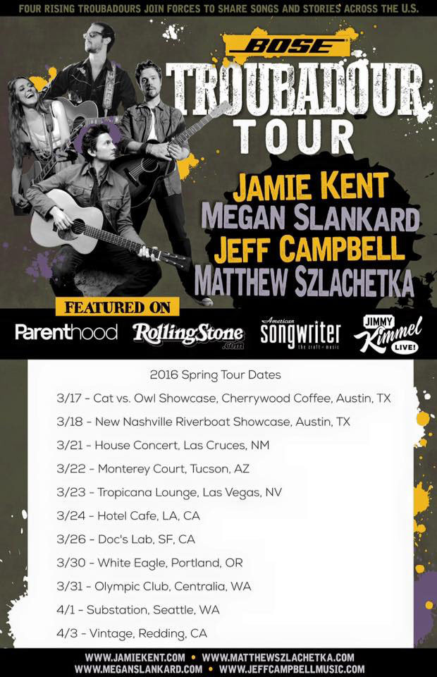 The itinerary for the spring 2016 leg of the Bose® Troubadour Tour. |
