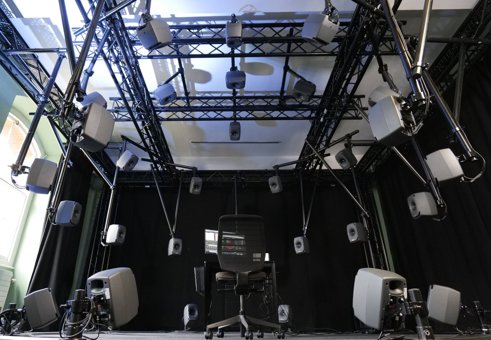 At the heart of the new Immersive Sound Lab, located in the King William Building of the Old Royal Naval College, is a 32.4 spherical array of Genelec Smart Active Monitors comprising 32 8331 three-way monitors and 4 7350 subwoofers. Calibrated using GLM software, the system supports high-resolution ambisonic recordings and formats including Atmos, DTS:X and Auro 3D – pushing creative boundaries in sound composition.