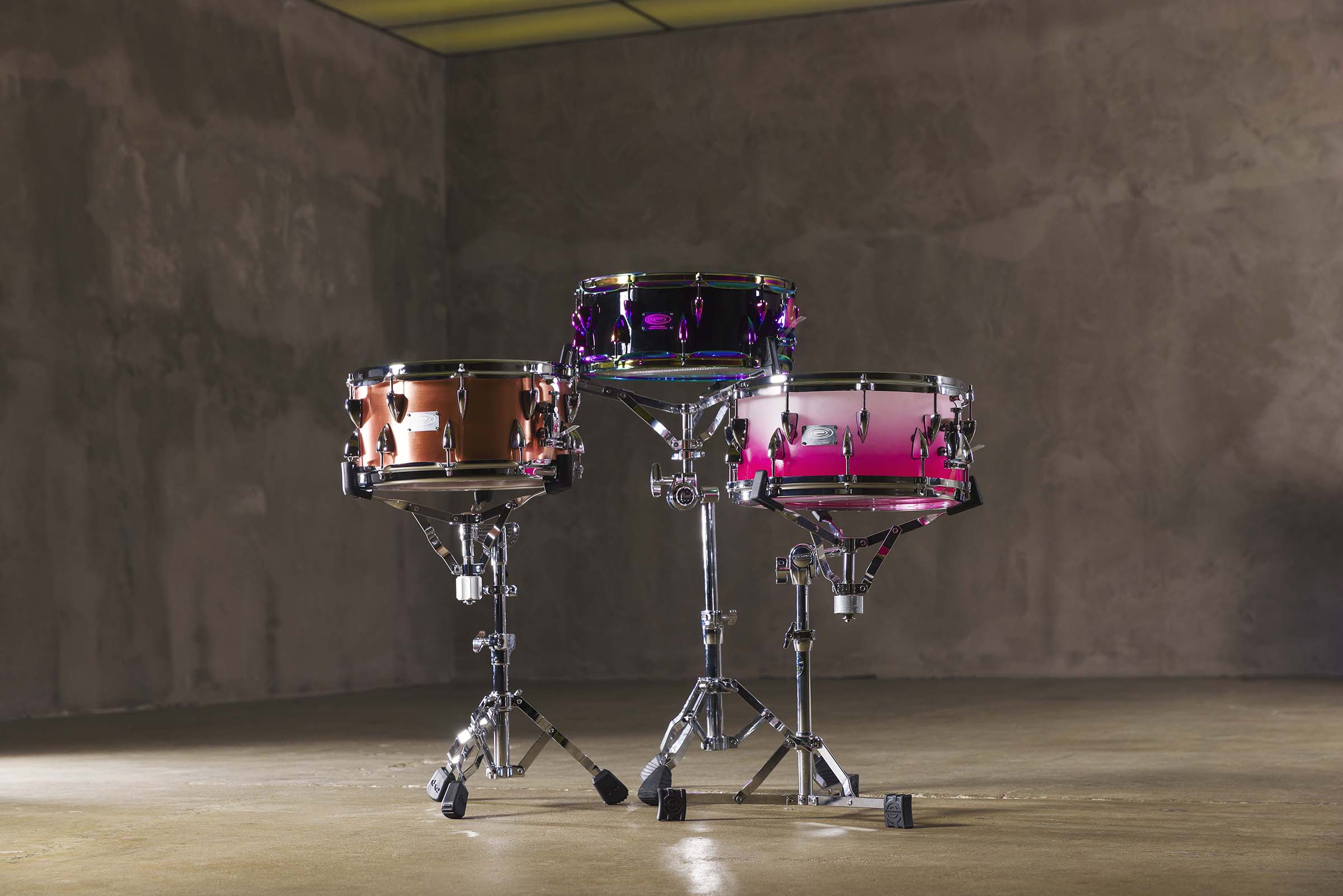 Photo caption 3: Shown are the OCDP Raw Copper Snare Drum 14 x 6.5 in., the Black Lacquer Birch Snare Drum with Spectrum Hardware 14 x 5.5 in., and the Bubblegum Frosted Acrylic Snare Drum with Die Cast Hoops-14 x 6.5 in.