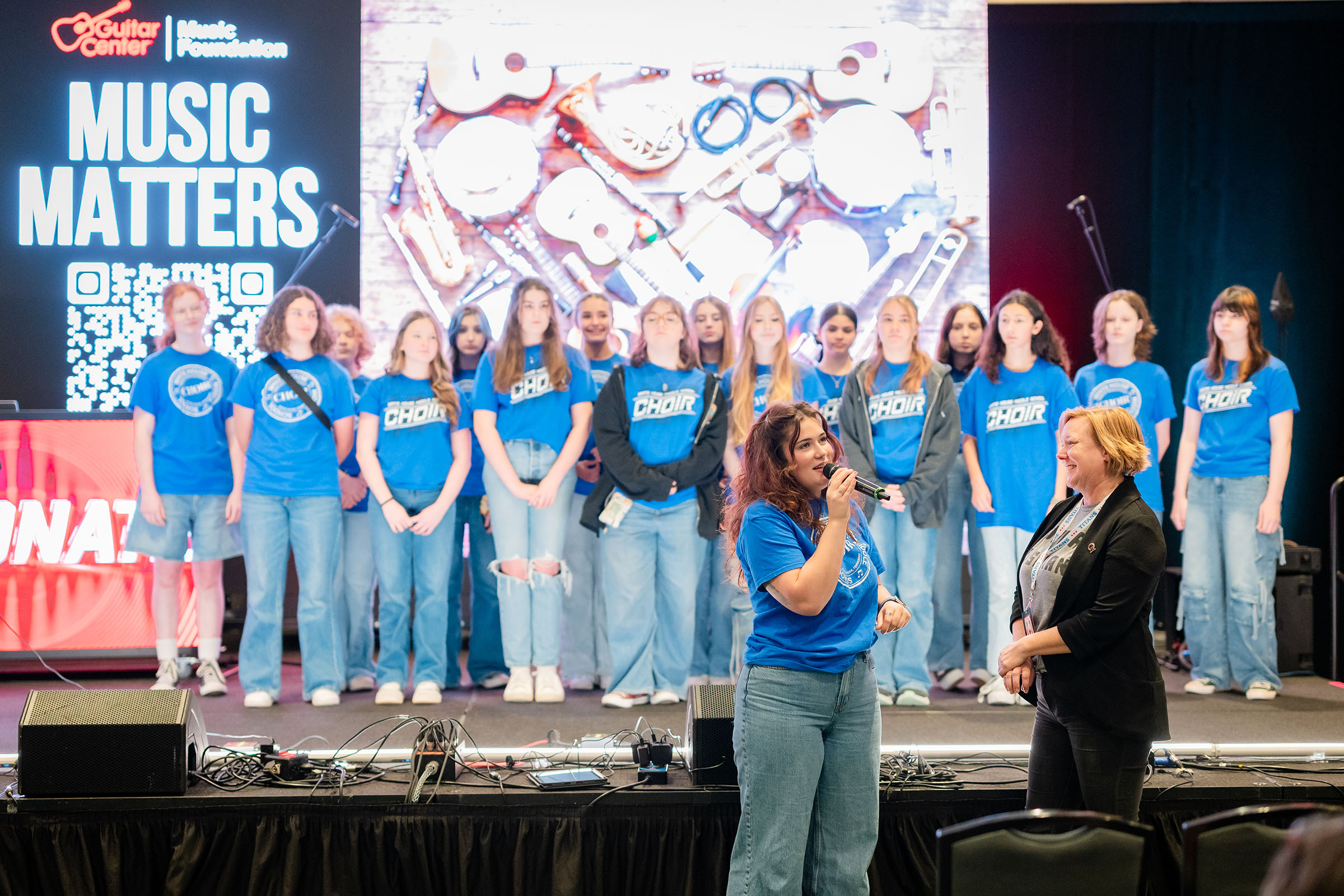 Photo 4 caption: The Guitar Center Music Foundation maintained a strong presence at Resonate expo, combining fundraising, live performance and advocacy for music education. The Foundation hosted a presentation on the importance of music education and featured a performance by the White House Middle School Choir, one of the Foundation’s grant recipients. Shown L-R: choir director and music teacher Kendall Hoeffler and Myka Miller, the Guitar Center Music Foundation Executive Director.