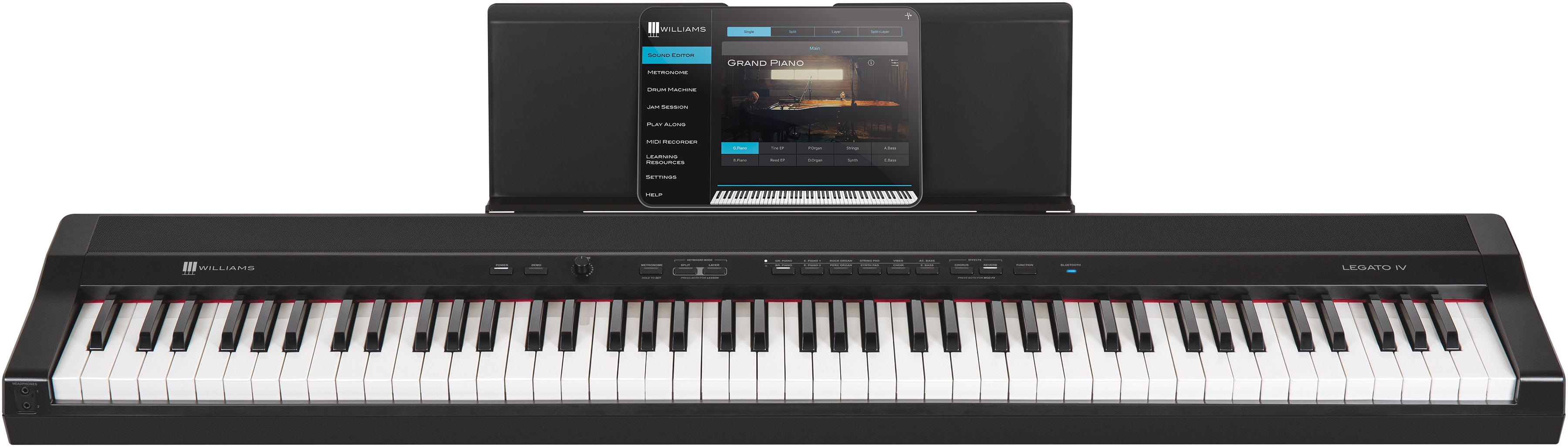 The free Williams Piano app for iOS allows players to use their iPad or iPhone to dig deeper into customization for the sounds and effects, select from four keyboard modes (single, split, layer and split+layer), call up a drum machine, tune the piano, play along with the music library on an iOS device and more.