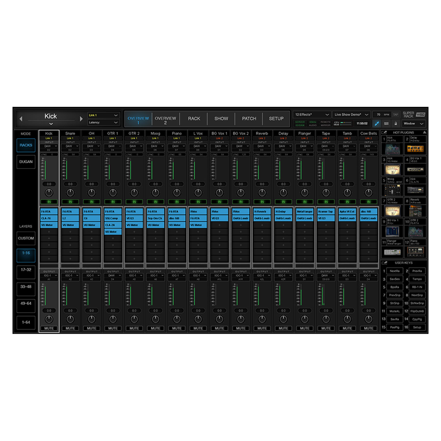 SuperRack is a natural extension of your mixing console, designed from the ground up for quick setup time, flexible touch-friendly workspace and unlimited workflow customization. FOH, monitor, broadcast, and AV engineers can now run plugins in real time, customize their workspace with floating windows, set extended-scope snapshots, and run any live show with more speed and confidence than ever before.